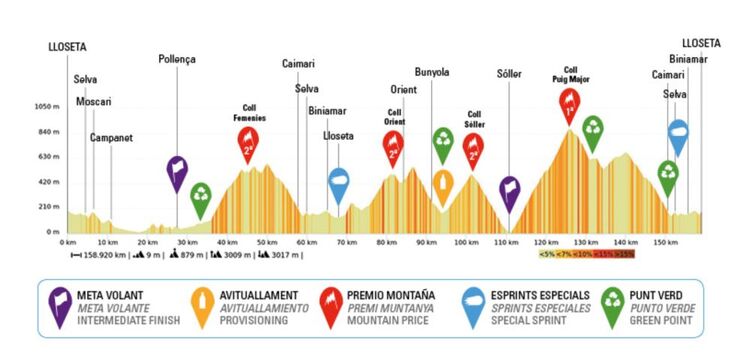 Zum Auftakt der Mallorca Challenge stehen zwar nur 154,7 Kilometer auf dem Programm, doch die haben es mit knapp 3000 Höhenmetern in sich. Praktisch den ganzen Tag geht es nur rauf und runter, neben den zahlreichen nicht klassifizierten Anstiegen warten noch drei Anstiege der 2. Kategorie – darunter der Coll de Soller nach 70 Kilometern – sowie einer der 3. Kategorie auf die Fahrer. Die letzte Möglichkeit zur Attacke bietet zwölf Kilometer vor dem Ziel der Coll de n`Esteve, ehe es von dort ins Ziel in Richtung Palmanova geht.