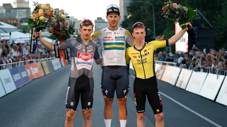 Henri Uhlig (links) auf dem Podium des Kriteriums in Adelaide vor dem Start der Tour Down Under. | Foto: Cor Vos
