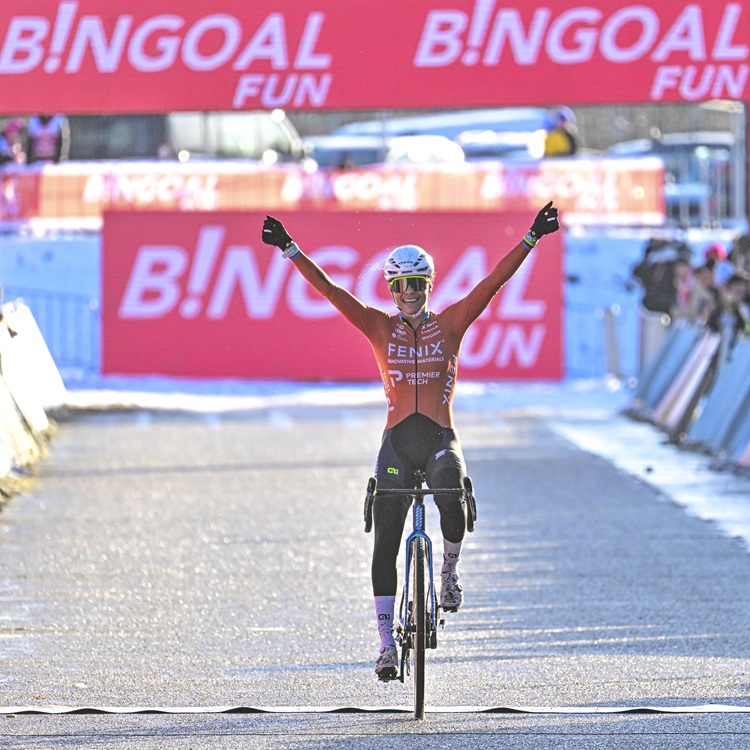 04.01.2026  |  (rsn) – Am Ende eines wahren Cross-Spektakels mit vielen Positionswechseln und Stürzen konnte Ceylin del Carmen Alvarado (Fenix - Premier Tech) beim Weltcup in Zonhoven die Arme jubelnd gen Himmel strecken. In der Schlussrunde hatte die Niederländerin von einem erneuten Fehler von Lucinda Brand (Baloise – Het Poetsbureau Lions) profitiert und sich entscheidend absetzen können. Brand kassierte bei winterlichen Bedingungen mit Schnee und Kälte zwar ihre dritte Niederlage bei 20 Saisoneinsätzen, baute als Zweite aber ihre Podiumsserie auf derer 61 und außerdem die Weltcup-Gesamtführung aus.