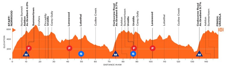Die 2. Etappe bringt das Rennen in die Adelaide Hills, wo auch der Rest des Rennens ausgetragen wird. 148 Kilometer stehen auf dem Plan, die von Norwood gleich vom Start weg hinauf zum Mount Lofty führt. Im weiteren Verlauf Richtung Uraidla muss zweimal die bei den Frauen mitentscheidende Corkscrew Road gemeistert werden. Bei etwas mehr als drei Kilometern Lange warten da im Schnitt 9,7 Prozent Steigung. Ins Ziel selbst geht es nach der zweiten Überfahrt aber überwiegend abschüssig, gespickt sind die letzten Kilometer mit ein paar kleinen Wellen.