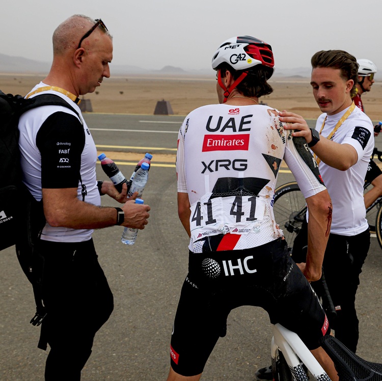 27.01.2026 | (rsn) – So hatte sich Jan Christen (UAE – Team Emirates – XRG) den Auftakt der 6. AlUla Tour (27. – 31. Januar / 2.Pro) sicher nicht vorgestellt. Im Rennverlauf landete der 21-jährige Schweizer bei zwei Stürzen unsanft auf dem Asphalt und musste von seinen Teamkollegen wieder ins Feld zurückgebracht werden.