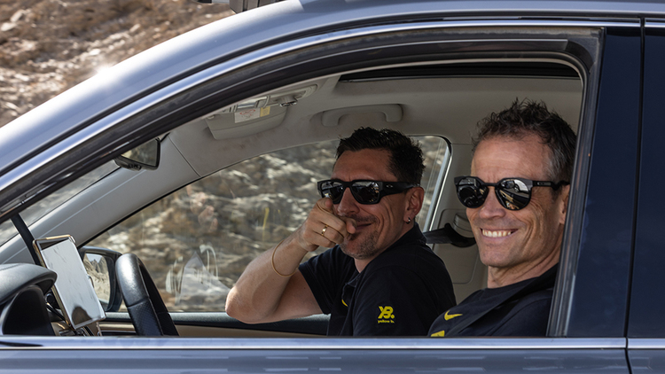 Robert Wagner (links) und Grischa Niermann hatten im Visma-Teamfahrzeug auf der 1. Etappe der Tour of Oman Zeit für Scherze. | Foto: Kevin Kempf