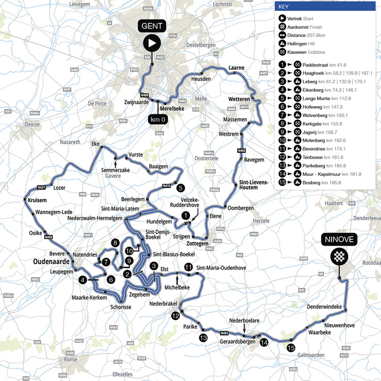 Die Entscheidung über den Sieg aber, das ist klar, fällt natürlich auch in diesem Jahr erst mit dem großen Kopfsteinpflaster-Doppel aus Muur-Kapelmuur und Bosberg (980 m bei 5,8%), die 15,7 beziehungsweise 11,8 Kilometer vor dem Ziel überquert werden. Die letzten elf Kilometer führen dann wellig und leicht abfallend nach Ninove zum Ziel.