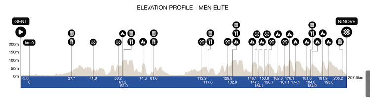 Das Streckenprofil des Omloop Nieuwsblad der Männer 2026. | Grafik: Flanders Classics