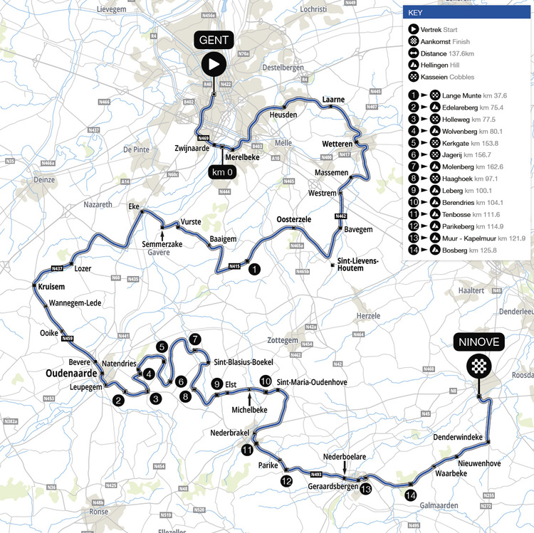 Vorher fahren die Frauen auf ihren ersten 77 Kilometern vom Sixdays-Velodrom 't Kuipke in Gents Zentrum über Merelbeke, Wetteren und Eke relativ simpel auf flacherem Terrain nach Oudenaarde. Die Männer dagegen absolvieren vor ihrer Passage durch den Holleweg bereits zwei Schleifen durch die flämischen Ardennen über das Kopfsteinpflaster von Haaghoek sowie Leberg und Eikenberg.