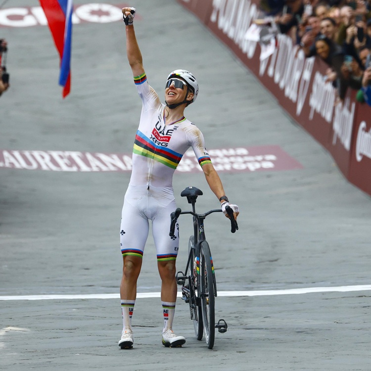 07.03.2026 | (rsn) - Weltmeister Tadej Pogacar (UAE – Emirates – XRG) hat in überlegener Manier das Schotterspektakel Strade Bianche gewonnen. Der Dominator der vergangenen beiden Jahre kam nach einem 80-Kilometer-Solo mit einer glatten Minute Vorsprung auf den Franzosen Paul Seixas (Decathlon – CMA CGM) ins Ziel an der Piazza del Campo in Siena und deutete mit diesem Auftritt an, dass er auch dieser Saison wohl seinen Stempel aufdrücken wird. Insgesamt fuhr Pogacar seinen vierten Sieg bei diesem Rennen ein und machte obendrein den Strade-Hattrick perfekt.