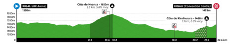 Das Zeitfahren der U23-Frauen beginnt wie die der Elite-Kategorien nach dem Start an der BK Arena zunächst mit einigen Kurven rund um die Arena und führt dann gen Süden zum 2,5 Kilometer langen und 5,8 Prozent steilen Anstieg der Cote de Nyanza, an dessen Ende auch die erste Zwischenzeit (Km 10,6) wartet. Dann aber geht es nicht auf der anderen Seite in die Abfahrt, sondern direkt rechts herum auf die andere Straßenseite und wieder hinunter in die rund neun Kilometer lange Abfahrt Richtung Zentrum von Kigali. Vorbei an der zweiten Zwischenzeit bei Kilometer 18 führt die U23-Strecke wie die der Elite-Frauen dann rechts ab und in den Kopfsteinpflaster-Anstieg zur Cote de Kimihurura (1,3 km bei 6,3%) hinein, an dessen Ende es kurz bergab und dann nochmal für rund 500 Meter bergan zum Ziel geht.