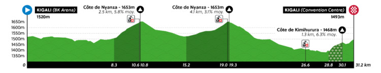 Wie bereits die Elite-Frauen am Sonntag so fahren auch die U23-Männer am Montag einen 31,2 Kilometer langen Kampf gegen die Uhr auf derselben Strecke. Im Vergleich zu den Elite-Männern bedeutet das, dass erstens der zweite Anstieg kürzer ist und außerdem der dritte Anstieg zur Cote de Péage am deutschen Teamhotel wegfällt. Nach dem Start an der BK Arena, einer 10.000 Menschen fassenden Mehrzweckhalle, in der der ruandische Basketballverband beheimatet ist, geht es leicht wellig in Richtung Süden und über die Cote de Nyanza (2,5 km bei 5,8% / 1. Zwischenzeit KM 10,6) zum Wendepunkt nach 17,7 Kilometern. Anschließend führt die Strecke über die andere Seite der Cote de Nyanza (4,1 km bei 3,1% / 2. Zwischenzeit KM 19,0) und lange hinunter in Richtung Zentrum von Kigali über die 3. Zwischenzeit bei Kilometer 26,6 und rechts ab in den 1,3 Kilometer langen Kopfsteinpflaster-Anstieg der Cote de Kimihurura (6,3 %), der auch die Straßenrennen prägen wird. Von der Kuppe geht es kurz bergab und dann auf den letzten 500 Metern nochmal bergauf zum Ziel am Convention Center.