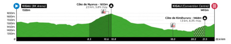 Das Zeitfahren der Junioren wird auf derselben Strecke ausgetragen, wie das der U23-Frauen. Es beginnt an der BK Arena zunächst mit einigen Kurven rund um die Arena und führt dann gen Süden zum 2,5 Kilometer langen und 5,8 Prozent steilen Anstieg der Cote de Nyanza, an dessen Ende auch die erste Zwischenzeit (Km 10,6) wartet – und der Wendepunkt. Es geht auf der anderen Straßenseite wieder hinunter in die rund neun Kilometer lange Abfahrt Richtung Zentrum von Kigali. Vorbei an der zweiten Zwischenzeit bei Kilometer 18 führt die U23-Strecke wie die der Elite-Frauen dann rechts ab und in den Kopfsteinpflaster-Anstieg zur Cote de Kimihurura (1,3 km bei 6,3%) hinein, an dessen Ende es kurz bergab und dann nochmal für rund 500 Meter bergan zum Ziel geht.