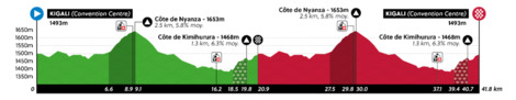 Anders als die Einzelzeitfahren beginnt das Teamzeitfahren der WM von Kigali nicht an der BK Arena, sondern am Convention Center, wo sich auch das Ziel befindet. Trotzdem bleibt die Übergabe des Staffelstabs vom einen zum anderen Geschlecht in der Mixed Staffel virtuell. Denn zwischen Zielstrich und Startrampe liegen rund 300 Meter. Zu fahren sind für die drei Frauen und drei Männer dann jeweils 20,9 Kilometer. Mit weniger Kurven als beim Start an der BK Arena geht es in Richtung Süden zur Cote de Nyanza (2,5 km bei 5,8%), wo wie im Zeitfahren der U23-Frauen und der Junioren der Wendepunkt oben auf der Kuppe kurz nach der ersten Zwischenzeit (KM 8,9) bei Kilometer 9,1 liegt. Es folgt die rund neun Kilometer lange Abfahrt in Richtung Zentrum und vorbei an der zweiten Zwischenzeit (KM 16,2), bevor bei Kilometer 18,5 die 1,3 Kilometer lange und im Schnitt 6,3 Prozent steile Kopfsteinpflasterrampe von Kimihurura beginnt, nach der ein kurzes Bergabstück und nochmal rund 500 Meter ansteigend zum Zielstrich folgen. Im Vergleich zum bereits sehr schweren Teamzeitfahren im Vorjahr in Zürich dürfte dieser Kurs nochmal etwas schwieriger sein und damit die schwerste Mixed-Staffel der Geschichte darstellen. Allerdings: Die größte Schwierigkeit kommt erst zum Schluss, weshalb die Gefahr, den dritten Fahrer oder die dritte Fahrerin schon früh zu verlieren, weniger groß ist, als 2024.